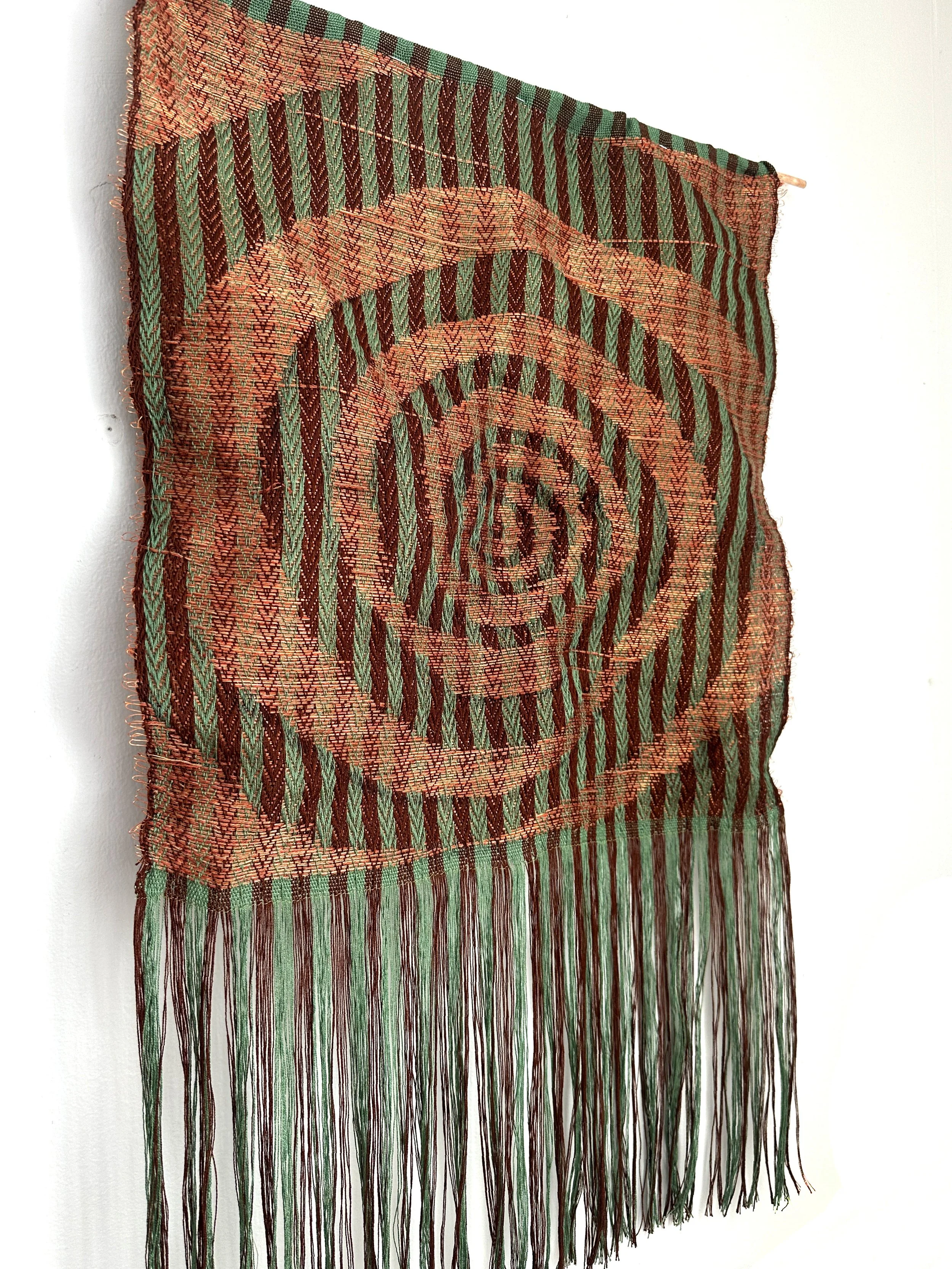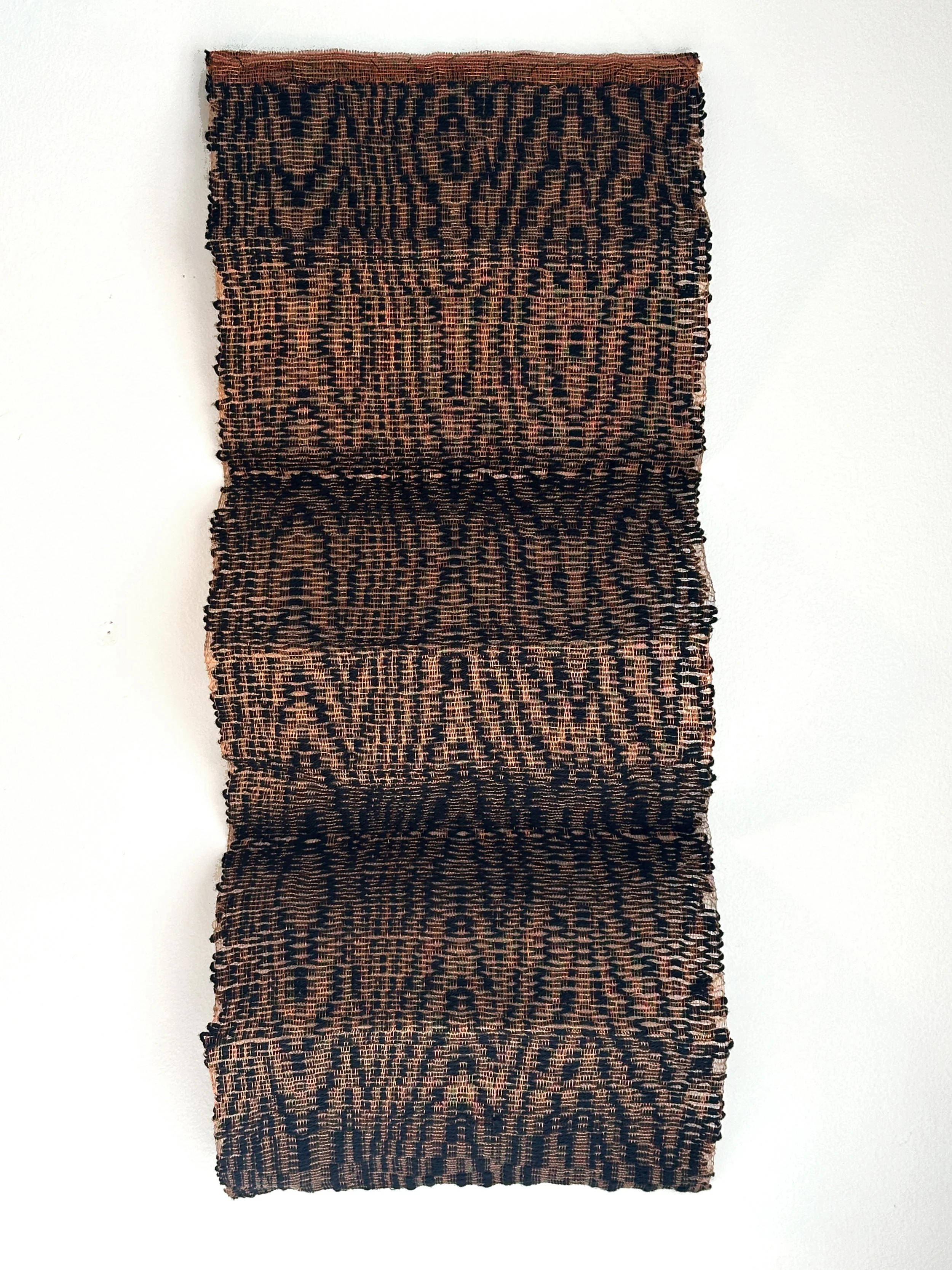 In contrast, tapestry and overshot techniques are adapted to form organic spirals and wood-like abstractions that reference the natural world. Through carefully developed threading and treadling sequences, encoded images gradually emerge. By emphasizing the computational nature of cloth through process, structure, and material, the digital and analog converge. This convergence suggests both hope and unease. Where digital screens function as extractive and disembodied media, textiles remain essential, dimensional, and alive. In this tension, my work reflects on humanity’s fragility, resilience, and capacity for renewal.
