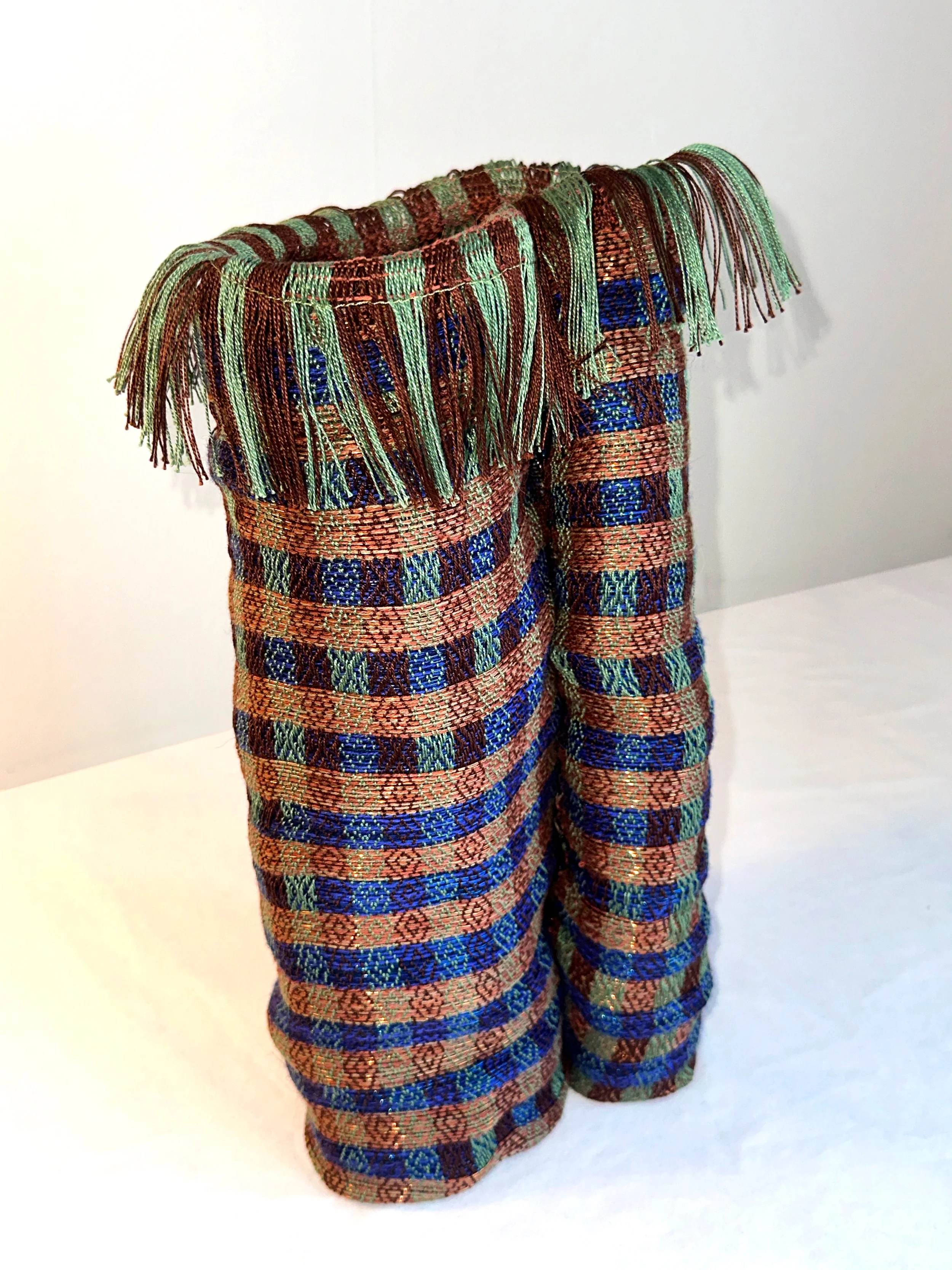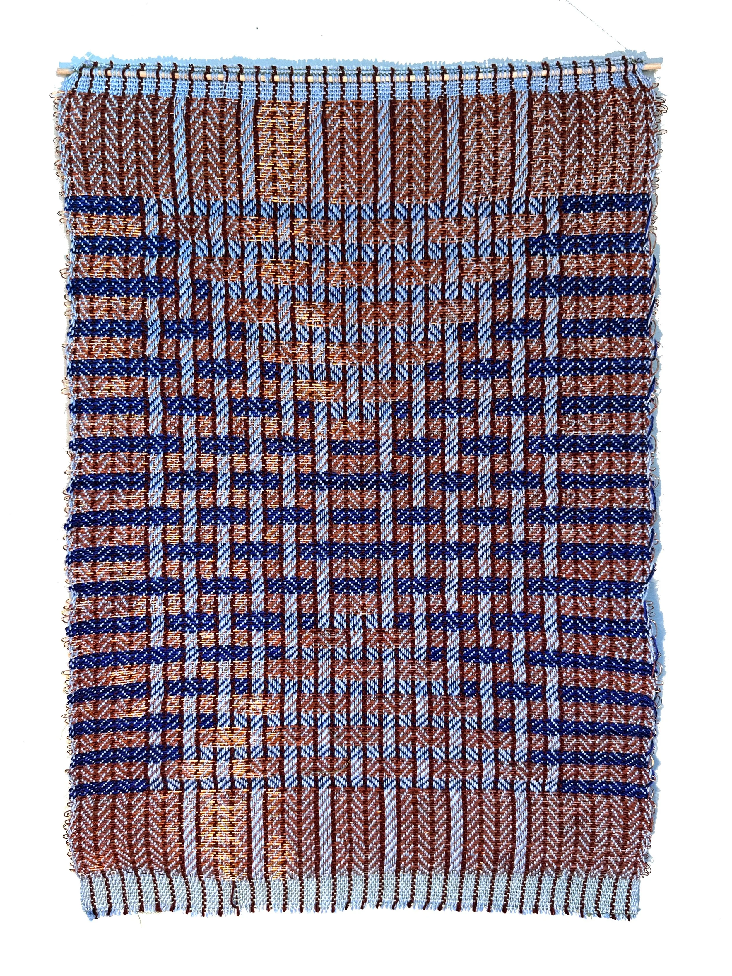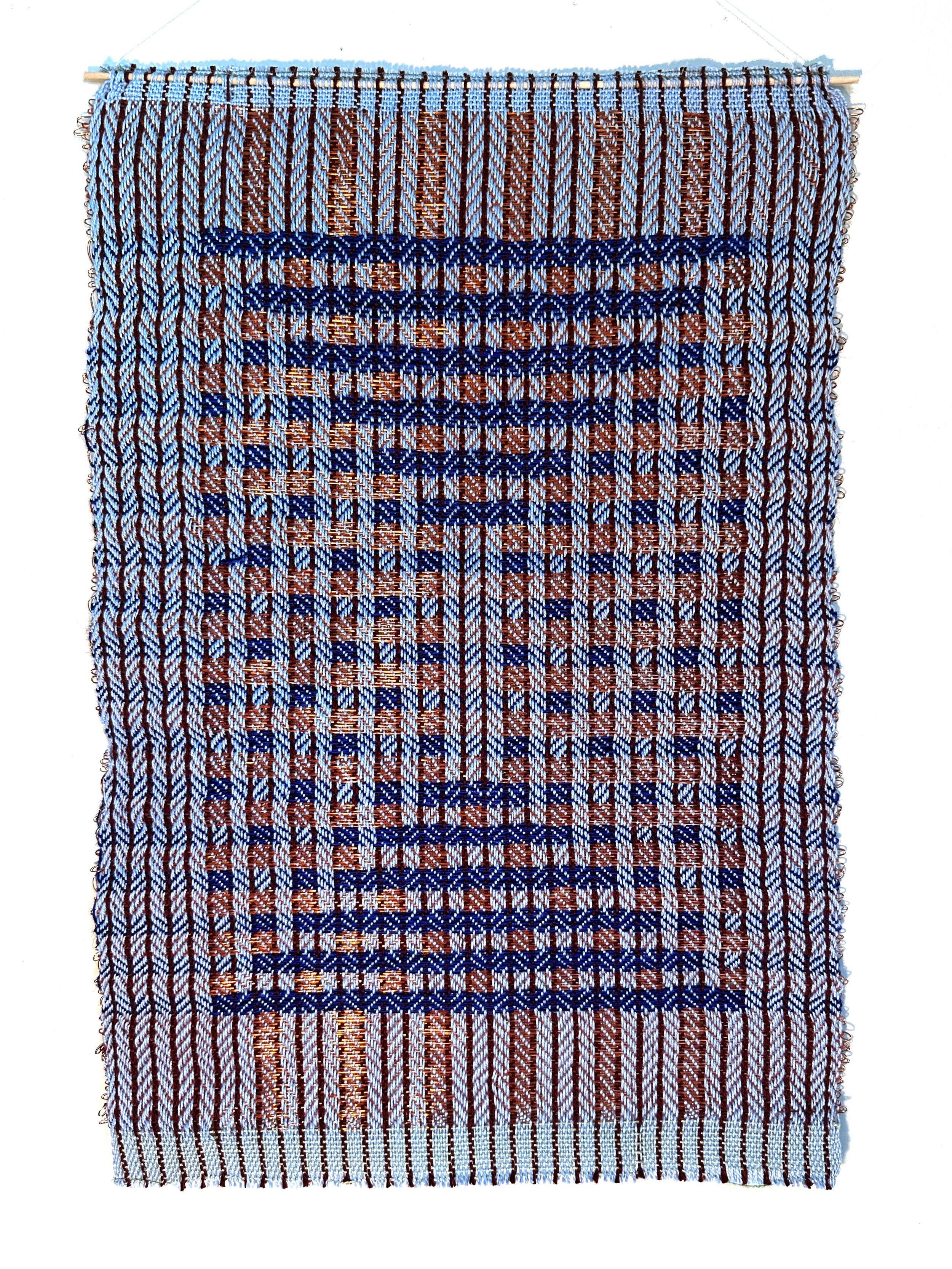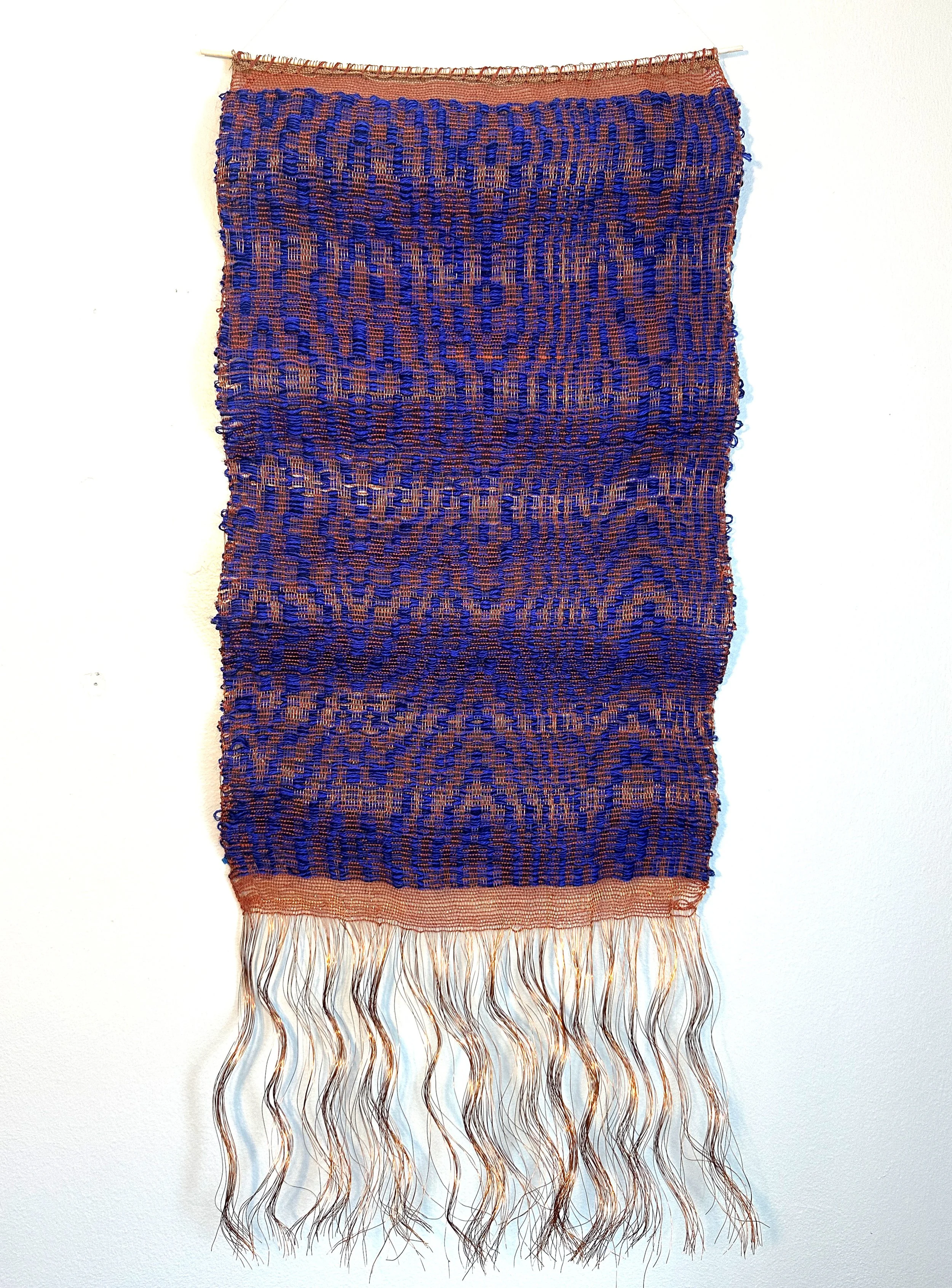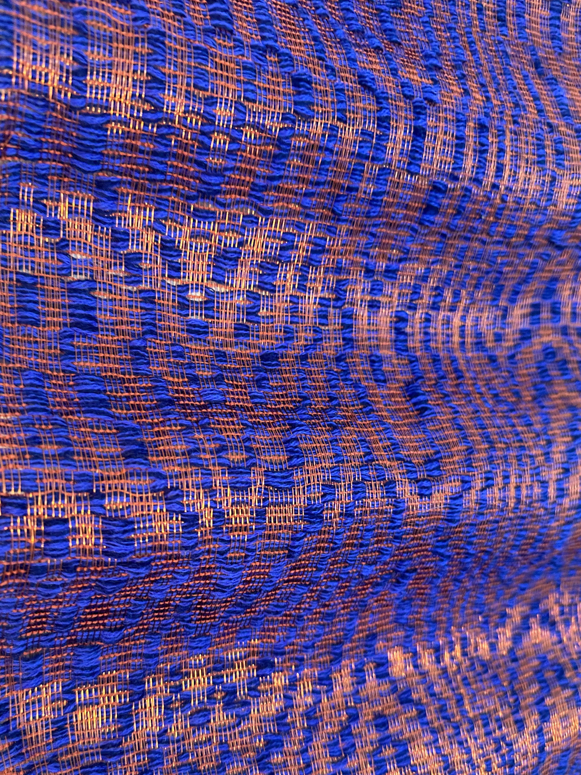 My series of copper weaves contrasts technique and technology. Copper is chosen for its longstanding role as a material of innovation—from ancient tools to the humble penny, and now to the essential wiring of AI data centers. It endures as a material of significance within our rapidly accelerating technological landscape. This new world materializes through reflective copper fibers set against electric blue wool and graphic striping.